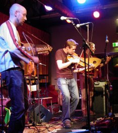 This picture of Hedningarna looks like a set of nice folkies with old acoustic instruments, but they had electrified and amplified them to levels Jimi Hendrix or Neil Young would approve of, and proceeded to rock out. Very few vocals, lots of rhythm and beat. Lots of tall white guys with shaved heads were jumping and moshing along. Nordic primal s